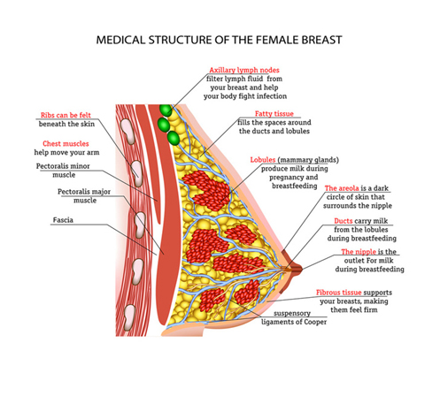 During pregnancy, the mother makes all the nutrients the baby needs to grow and thrive in the womb. After the baby is born the breasts naturally begin to provide milk, making as much as is needed to feed the baby. The primary function of female breasts is to produce milk in order to nourish an infant, a process called lactation. The breasts, which are composed primarily of fatty tissue, also contain milk producing glands called lobules. Lobules are connected to the nipple by a network of tubes called milk ducts. The breasts produce milk from water and nutrients removed from the bloodstream. The milk is stored in the lobules until the hormone oxytocin signals the tiny muscles in the lobules to contract and push the milk through the ducts.
